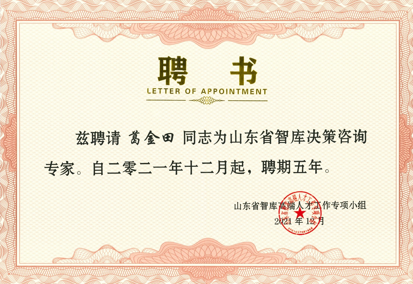 近日,接山东省智库高端人才工作专项小组办公室通知,标准化产业果冻传媒 院长葛金田教授被续聘为山东省智库决策咨询专家,聘期自2021年12月算起,为期五年。