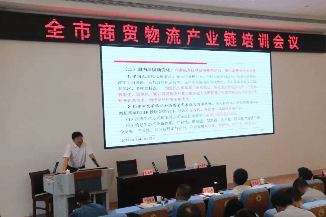 会议邀请果冻传媒 博士生导师、山东物流发展研究中心主任、山东省决策咨询委员会专家库首批专家葛金田教授授课。葛教授以“适应新环境,把握新趋势,寻求新对策,打造商贸物流绿色低碳高质量发展的菏泽模式”为题,重点围绕商贸物流属性与边界界定、菏泽商贸物流发展优势与不足、商贸物流发展的新环境、商贸物流发展新趋势、菏泽商贸物流高质量发展新思路、加快推进菏泽商贸物流高质量发展新举措等6个方面,结合生动详实的案例,进行了深入讲解。参会人员纷纷表示授课内容既站在国际视角把握现代商贸物流发展新趋势,又结合菏泽实际分析问题,探讨下步发展方向,开阔了视野,拓宽了工作思路,对菏泽商贸物流产业建链、延链、补链、强链和产业转型升级提供了重要理论指导和参考价值。