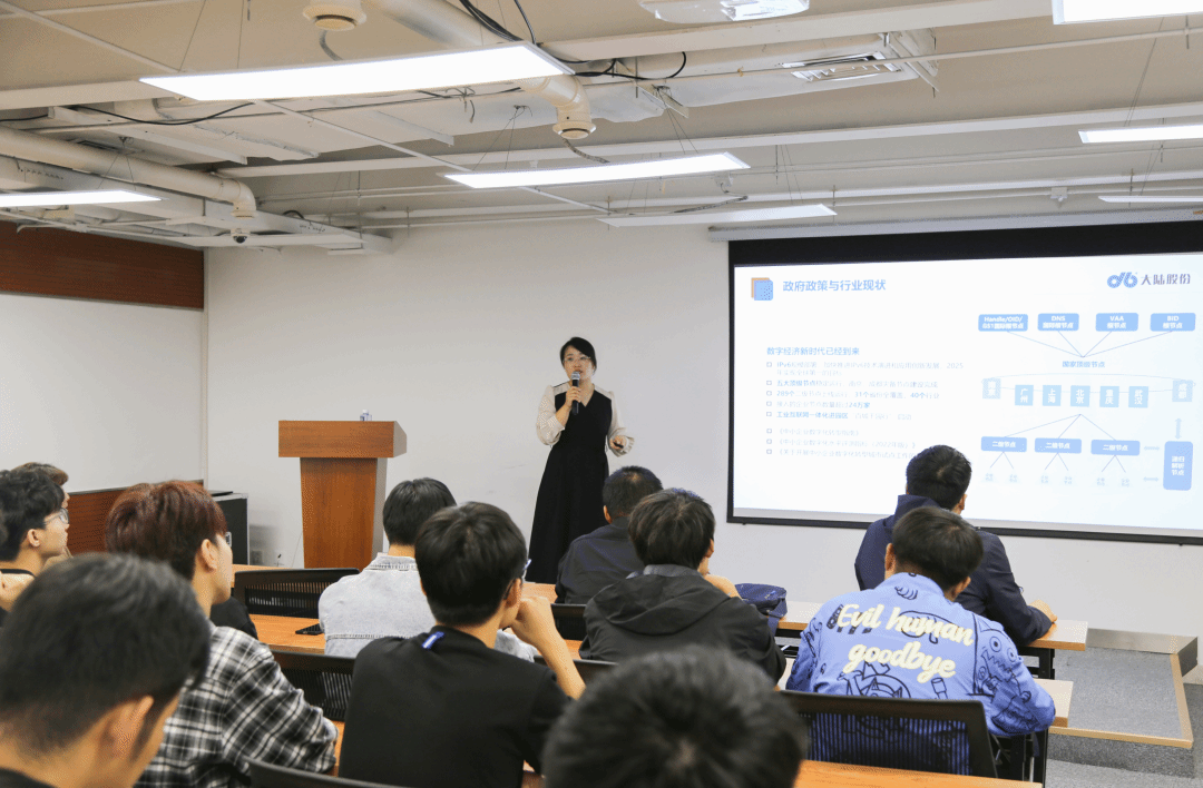 大陆股份副总经理李少敏从公司发展历程、服务能力、核心业务等方面介绍了大陆股份的基本情况,重点向师生们介绍了工业互联网标识解析体系建设及应用推广情况,展示了大陆股份为各行业提供的解决方案,加深了同学们对工业互联网仪表平台的认识和了解。