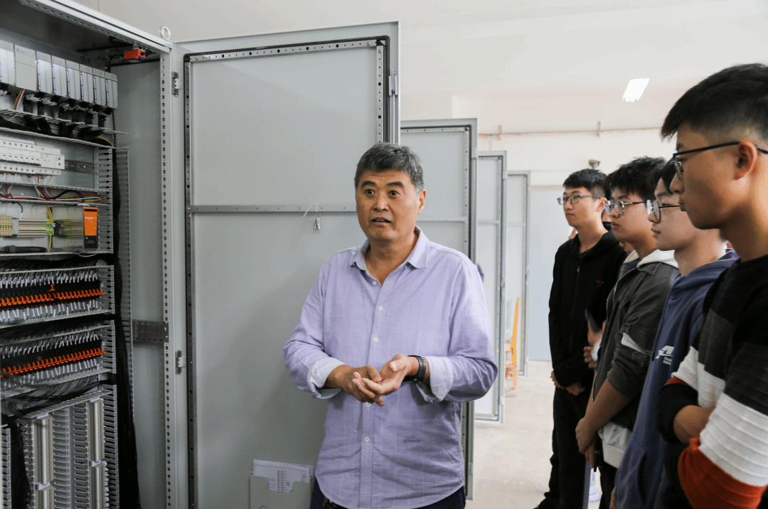 在大陆机电一楼车间,工程服务中心王书奎为大家详细讲解了车间DCS机柜安装流程,整个机柜间线缆标识采用鱼骨式的接线设计,干净整洁、美观大方,让师生们感受到了大陆股份工控典范。
