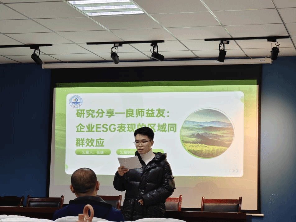 任缘同学以《良师益友:企业ESG表现的区域同群效应》一文为切入点,从选题背景、研究假设、研究设计及个人感悟等方面展开论述,并与老师进行了交流探讨。不仅如此,他还积极分享了自己的学习感悟。他提到,在方法导向下,要善于立足题目但又具备跳出题目的思维视野:在课题导向下,要紧扣题目,对假设和课题的严谨性反复推敲。同时他还鼓励同学们在学习过程中不要畏惧与导师交流,对于最新的工具与方法,应以开放的心态去接纳并合理运用。