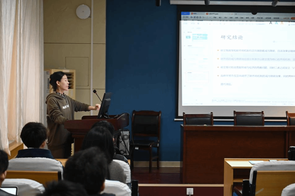 秦瑶同学依托《碳交易政策及碳市场机制的经济与减污降碳效应研究——兼论市场机制与政府干预两者间的替代效应》这一研究课题,阐述了学术论文的文献梳理、研究思路、研究方法及结论创新等关键环节,并就研究主题在题目上的体现、研究假设与结论的对应关系、研究创新点的优化建议,与老师们展开了积极探讨。除此之外她还分享了许多在论文写作方面的思路与心得。