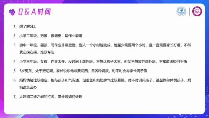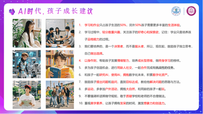 满黎黎老师就当下AI带给大家的感受、AI会让孩子未来的职业发展有什么变化、孩子需要哪些技能来适应AI时代以及AI会令家庭教育发生什么变化四个方面进行了分享。其中,满老师提到的AI对孩子未来职业发展的影响、孩子需要培养的面向未来的技能、“条件允许的情况下,父母系统学习一门家长课程,是比给孩子上任何兴趣班都更有价值的投资”、“当下教育最大的挑战是用过去40年的成功经验,养育想在未来40年取得成功的孩子”、“学习过程中,轻分数重兴趣,关注孩子的好奇心和探索欲,学业只是培养孩子品格能力的过程”等观点非常具有启发性。