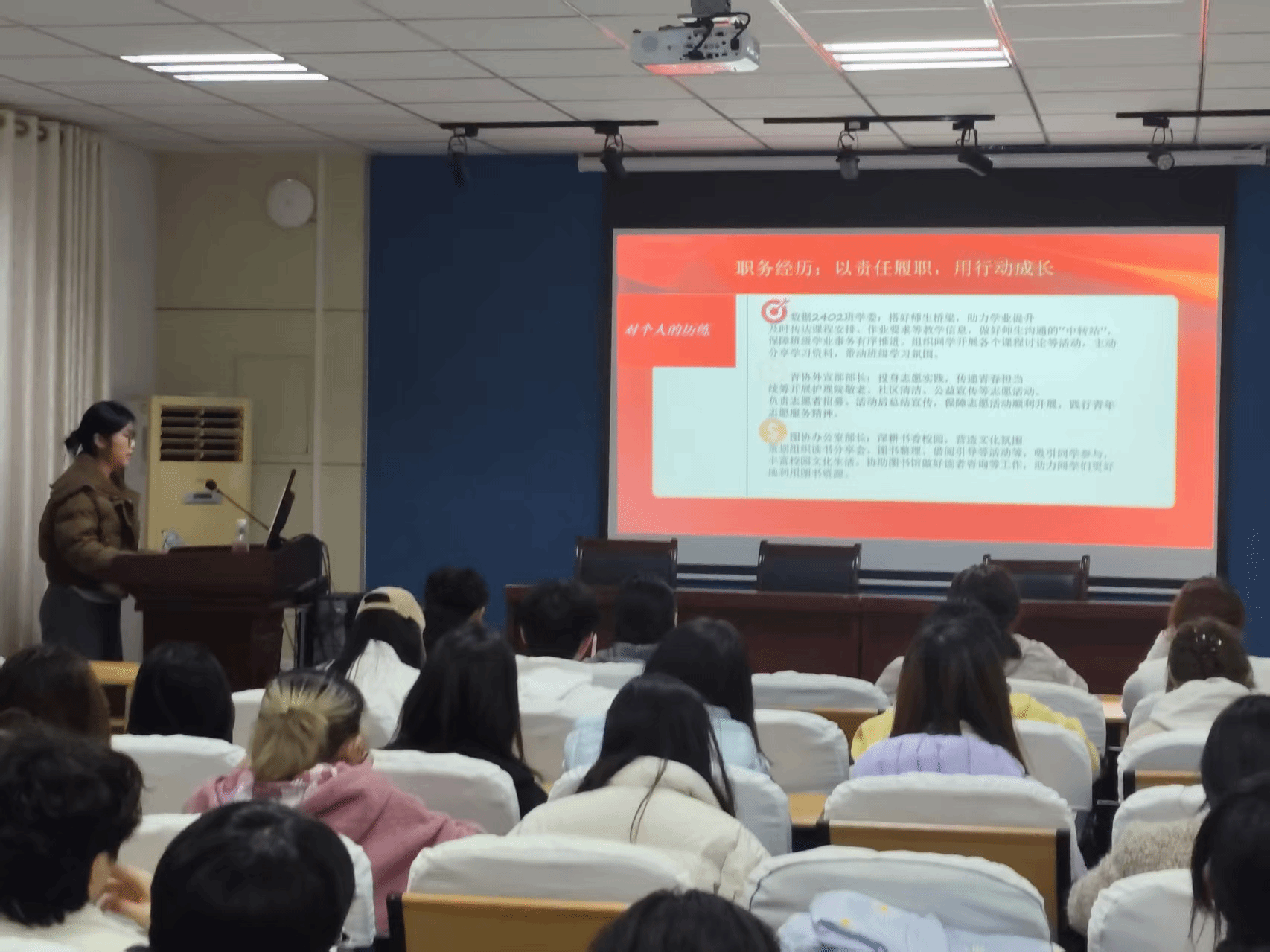 每位申请人答辩结束后,2024 级团支书评委团严格依据 “内容完整性、表达流畅度、综合素质匹配度” 三大评分维度现场打分,同时结合答辩内容提出针对性建议,既保障选拔过程的公平公正,也为申请人提供清晰的成长方向。